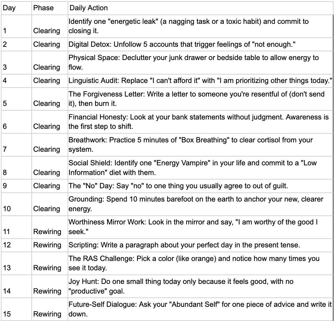 As you clear the physical space, you must also clear the linguistic space. For these ten days, you must strike the phrases "I can't afford it" and "I don't have time" from your vocabulary. Even if those things feel true in the moment, repeating them reinforces the scarcity loop. Instead, we use "bridge statements" like, "I am currently prioritizing other things," which shifts you from a victim of circumstances to a conscious creator of your schedule.